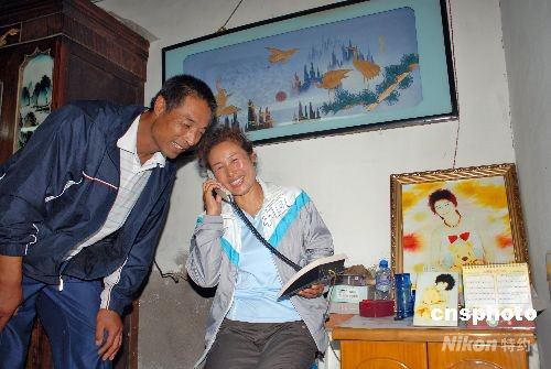 中國女子曲棍球隊在29屆北京奧運會奪得銀牌,賽后趙玉雕的父母在家鄉(xiāng)打電話給女兒。中新社發(fā) 谷進 攝