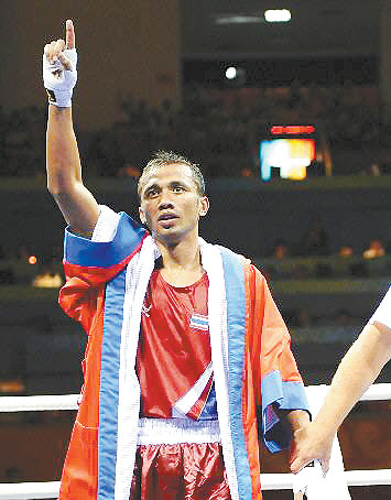 在今天的半決賽中,出場(chǎng)時(shí)的汶尊儂,沉穩(wěn)得像個(gè)書(shū)生。在以10∶5的大比分戰(zhàn)勝古巴選手伊格萊西亞斯后,有拳迷向他獻(xiàn)上祝賀的鮮花,他虔誠(chéng)而又恭敬地雙手合十,表示感謝。