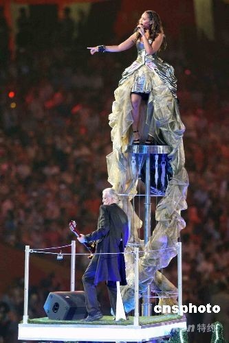 8月24日晚,北京奧運(yùn)會(huì)閉幕式在奧林匹克公園內(nèi)的國(guó)家體育場(chǎng)舉行,下屆奧運(yùn)會(huì)主辦地倫敦市在“鳥巢”上演倫敦8分鐘節(jié)目,在英國(guó)大型選秀節(jié)目“XFactor”中脫穎而出的偶像歌手利昂娜·劉易斯與英國(guó)著名搖滾樂隊(duì)“齊柏林飛船”的主音吉他手吉米·佩齊聯(lián)袂獻(xiàn)歌;還有英國(guó)民歌、都市街舞、Hip-Hop霹靂舞等表演。中新社發(fā) 任晨鳴 攝