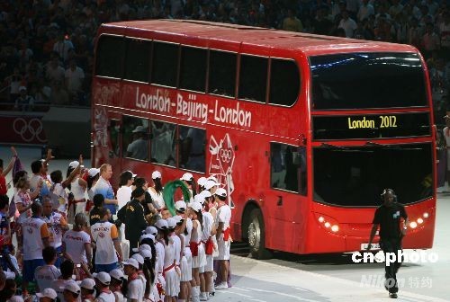 8月24日晚,北京奧運(yùn)會(huì)閉幕式在奧林匹克公園內(nèi)的國家體育場舉行,下屆奧運(yùn)會(huì)主辦城市倫敦市上演“倫敦8分鐘”演出,一輛倫敦標(biāo)志性的雙層紅色巴士駛?cè)搿傍B巢”體育場。中新社發(fā) 任晨鳴 攝