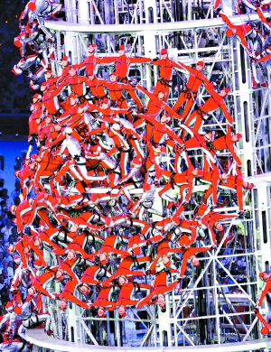 陳維亞說,2006年11月11日,閉幕式團隊剛剛成立,最初的創(chuàng)意中就有這么一個“塔”,這是從苗族的踩刀梯表演中獲得的靈感。最早的設(shè)想是用搭梯子方式進行,由于存在安全隱患而放棄。最后,主創(chuàng)人員找到了現(xiàn)在的形式,就是由人去攀登“記憶之塔”。396人徒手攀登,更加直觀地體現(xiàn)了拼搏精神。
