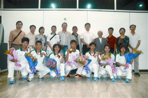 隨著北京奧運(yùn)會(huì)閉幕,同期進(jìn)行的“北京2008武術(shù)比賽”正式結(jié)束,代表澳門(mén)參與比賽的7位運(yùn)動(dòng)員及教練團(tuán)成員,帶著世界最高規(guī)格的武術(shù)賽獎(jiǎng)牌,25日晚8時(shí)返抵澳門(mén)國(guó)際機(jī)場(chǎng)。澳門(mén)武術(shù)總會(huì)副理事長(zhǎng)李文欽、體育委員尹君樂(lè)到場(chǎng)迎接。