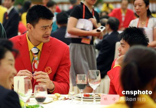 姚明、林丹參加北京奧運(yùn)中國(guó)體育代表團(tuán)慶祝宴會(huì)。中新社發(fā) 廖文靜 攝