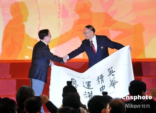 八月二十九日晚,香港特區(qū)政府在會(huì)展中心舉行酒會(huì)歡迎北京奧運(yùn)會(huì)內(nèi)地金牌運(yùn)動(dòng)員代表團(tuán)訪港。圖為特首曾蔭權(quán)向國(guó)家體育總局局長(zhǎng)、代表團(tuán)團(tuán)長(zhǎng)劉鵬致送一幅國(guó)學(xué)大師饒宗頤書(shū)寫(xiě)的“奧運(yùn)精英 光耀中華”字畫(huà)。中新社發(fā) 鄧慶樂(lè) 攝