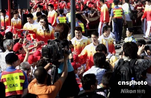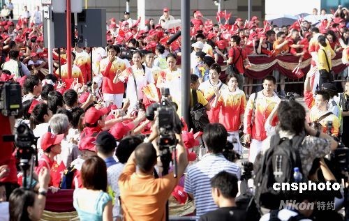 八月三十日上午八時(shí),北京奧運(yùn)會(huì)內(nèi)地金牌運(yùn)動(dòng)員代表團(tuán)到香港金紫荊廣場觀看升旗禮,圖為運(yùn)動(dòng)員與大批香港市民見面。中新社發(fā) 張勤 攝