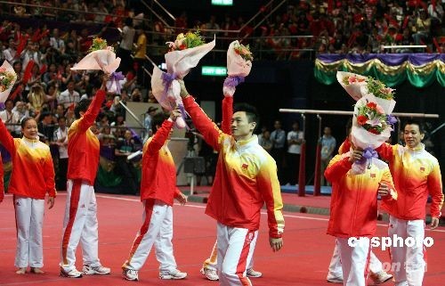 楊威、鄒凱、李小鵬、肖欽、黃旭、陳一冰等選手與香港觀眾近距離接觸。他們的精彩表演,博得全場熱烈的掌聲。中新社發(fā) 洪少葵 攝