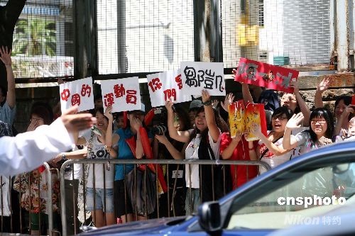 北京奧運會內(nèi)地金牌運動員代表團在香港伊麗莎白體育館作示范表演,大批 “粉絲”在場外苦候,希望一睹金牌選手風采。中新社發(fā) 洪少葵 攝