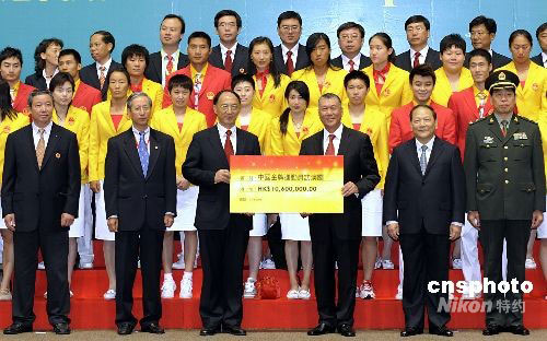 圖為澳門特區(qū)行政長官何厚鏵向代表團(tuán)頒發(fā)獎(jiǎng)金。