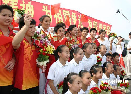 9月3日15時30分,北京奧運會冠軍鄒凱、殷劍在家鄉(xiāng)人民的熱烈歡迎中回到了四川。在2008北京奧運會上,來自四川瀘州的鄒凱勇奪自由體操、單杠、男子體操團體三枚金牌,來自涼山的殷劍為中國代表團拿下了第一枚奧運會帆船金牌。中新社發(fā) 霍潺 攝