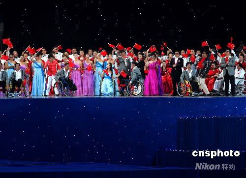 北京2008殘奧會(huì)開幕式將于9月6日晚8時(shí)在北京國家體育場“鳥巢”舉行,開幕式前,殘疾人藝術(shù)團(tuán)體及藝人登臺進(jìn)行文藝表演。 中新社發(fā) 宋吉河 攝