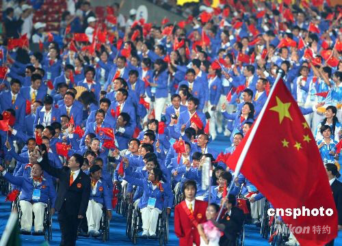 9月6日晚,北京2008殘奧會(huì)開幕式在北京國家體育場——“鳥巢”舉行,圖為由547人組成的龐大東道主代表團(tuán)--中國殘奧代表團(tuán)入場,旗手是刷新3項(xiàng)世界紀(jì)錄的20歲的中國殘疾人游泳運(yùn)動(dòng)員王曉福。 中新社發(fā) 宋吉河 攝