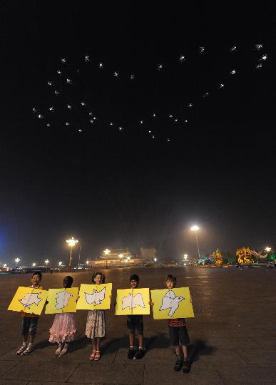 9月6日,來(lái)自中國(guó)、喀麥隆、以色列、巴基斯坦和愛(ài)爾蘭(從左到右)的小朋友舉起和平鴿圖片與天安門(mén)上空的和平鴿造型焰火遙相呼應(yīng)。當(dāng)日,北京2008年殘奧會(huì)開(kāi)幕式在國(guó)家體育場(chǎng)隆重舉行。新華社記者 王小川 攝