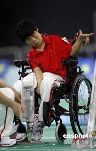 9月7日,北京殘奧會硬地滾球比賽,中國選手朱賀僑在混合單打BC3級別小組賽中以1比11不敵希臘選手格里戈里奧斯。中新社發(fā) 杜洋 攝