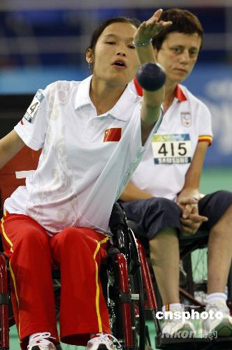 9月8日,北京殘奧會(huì)硬地滾球混合單打-BC4級(jí)小組循環(huán)賽中,中國(guó)選手戚翠芳以8比3的比分戰(zhàn)勝巴西選手桑托斯,順利晉級(jí)四分之一決賽。 中新社發(fā) 杜洋 攝