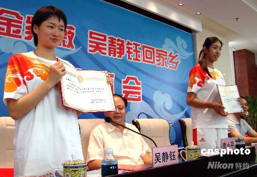 9月8日,江西省景德鎮(zhèn)市熱烈歡迎北京奧運會冠軍金紫薇、吳靜鈺載譽回鄉(xiāng),景德鎮(zhèn)市婦聯(lián)和團委分別授予兩人“三八紅旗手標兵”稱號和“五四青年獎?wù)隆。在此次北京奧運會上,金紫薇和吳靜鈺分別奪得賽艇女子4人雙槳項目和跆拳道女子49公斤級比賽冠軍。 中新社發(fā) 程萬海 攝