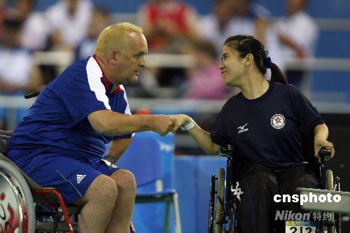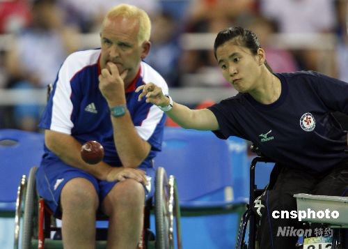 9月9日,中國(guó)香港選手郭,撛谟驳貪L球混合單打-BC2決賽中,戰(zhàn)勝英國(guó)選手奈杰爾-莫里,為中國(guó)香港隊(duì)摘得殘奧會(huì)首枚金牌。中新社發(fā) 杜洋 攝