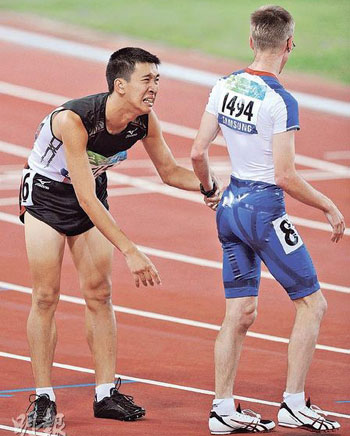 蘇樺偉(左)只獲第6名,面露失望神色,英國選手Graeme Ballard(右)緊握他的手安慰。(圖片來源:明報)
