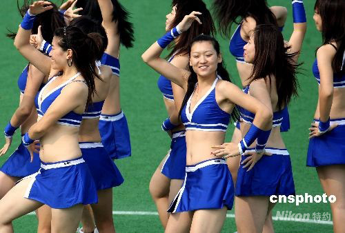 9月17日下午,北京殘奧會(huì)五人制足球決賽在北京奧林匹克公園內(nèi)的橄欖球場(chǎng)舉行,中國(guó)隊(duì)與雅典殘奧會(huì)冠軍巴西隊(duì)冒著高溫奉獻(xiàn)一場(chǎng)精彩的比賽。比賽間隙,衣著性感的啦啦隊(duì)為觀眾奉獻(xiàn)熱舞。 中新社發(fā) 任晨鳴 攝