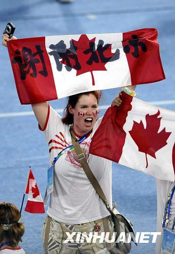一名加拿大代表團(tuán)成員舉著寫有“謝謝北京”字樣的國旗入場。