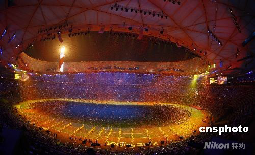 9月17日晚,北京2008年殘奧會(huì)閉幕式在國(guó)家體育場(chǎng)“鳥(niǎo)巢”盛大舉行。閉幕式上灑遍“鳥(niǎo)巢”的香山紅葉和殘奧圣火交相輝映。 中新社發(fā) 盛佳鵬 攝