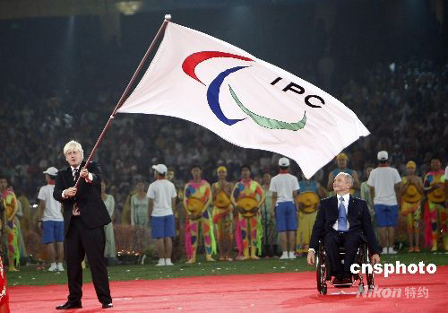 9月17日晚,北京2008年殘奧會(huì)閉幕式在國(guó)家體育場(chǎng)舉行。倫敦市長(zhǎng)約翰遜在交接旗儀式上,揮舞國(guó)際殘奧委會(huì)會(huì)旗。 中新社發(fā) 杜洋 攝