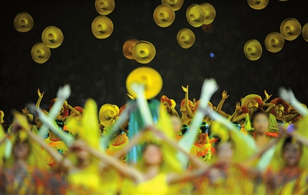 “歡慶篇章”是整臺晚會“寄給未來的一封信”的壓軸戲,而“草帽舞”是“歡慶”中的高潮部分、晚會的亮點(diǎn)之一。昨晚草帽舞華麗登場時,成都的姑娘們從舞臺的左臺口向舞臺的右底角走“斜線一字”,動作整齊,節(jié)奏分明,邊行進(jìn)邊傳遞草帽,她們的隊列沉穩(wěn)舒緩,時圓時方,變化萬千。到達(dá)鳥巢中間時,草帽突然像金色的花朵,從演員手中快速飛出,在空中彼此飛舞,宛如向日葵花簇簇綻放,蔚為壯觀。而在草帽舞隊的四周,還有兩千多人輔以奔放灑脫的舞蹈表演。此時鳥巢內(nèi)已是掌聲雷動,歡呼陣陣。整個節(jié)目傳遞的是青春、是快樂,是少女的激情與奔放,是自由與陽光,是未來的希望,表演服飾也以紅黃為主調(diào),大紅艷麗,大黃成熟,直奔?xì)g慶主題。成都的姑娘們退場后激動地說,她們的自信和當(dāng)晚的演出成功,離不開奧組委領(lǐng)導(dǎo)的關(guān)心支持。據(jù)悉,這批專業(yè)演員全部由成都市文化藝術(shù)學(xué)校的專業(yè)舞蹈學(xué)生、演員和舞蹈教師組成。(周帥)