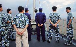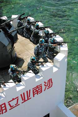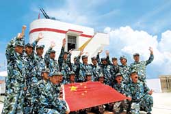 赤瓜礁附近海面,游弋著我海軍執(zhí)行戰(zhàn)斗值班任務(wù)的導彈護衛(wèi)艦。在遙遠的南?吹阶约旱膽(zhàn)艦,大家都很激動。老實說,中華民族的和平發(fā)展是任何人也不能阻擋的。作為祖先留給我們的一筆大遺產(chǎn),南沙理應成為我們由陸地向海洋、由淺藍向深藍進行戰(zhàn)略發(fā)展的一個大空間。隨著人們對海洋的認識不斷深化,隨著人類對海洋資源開發(fā)利用的能力不斷提高,南沙的戰(zhàn)略價值正日益凸顯。每次與南沙衛(wèi)士座談,他們都呼吁,強化海洋意識、海權(quán)意識、海軍意識,正當其時。
