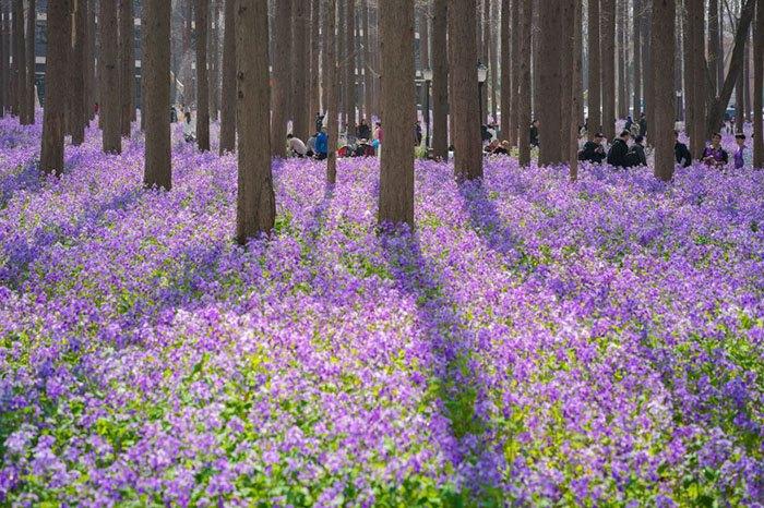 春滿校園二月蘭盛開(kāi) 紫色花海景色迷人