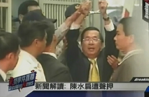 圖:陳水扁被銬上手銬收押
