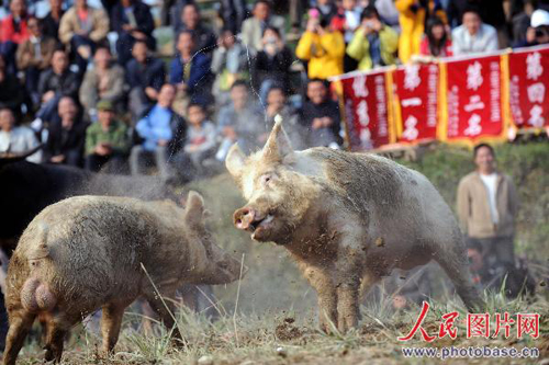 圖:貴州苗族舉行斗牛斗豬賽歡度苗年