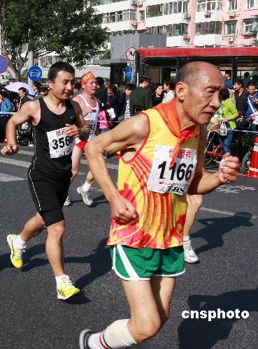 圖:北京國際馬拉松賽場上不服老的爺爺