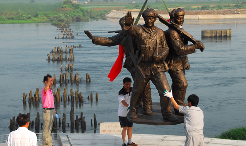 為紀(jì)念抗美援朝戰(zhàn)爭60周年,由丹東市委宣傳部組織實(shí)施的兩組主題分別為《送別親人》和《告別祖國》的雕塑昨日(5日)下午運(yùn)抵抗美援朝戰(zhàn)爭遺址——鴨綠江燕窩鐵路橋和鴨綠江沙河口鐵路橋。