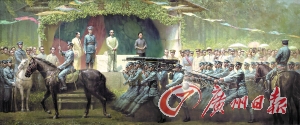 對(duì)于潘嘉俊來(lái)說(shuō),他的黃埔情結(jié)似乎更加濃烈些,21年的軍旅生涯讓他對(duì)軍事題材的創(chuàng)作格外有激情,“我熟悉黃埔軍校,并畫(huà)過(guò)有關(guān)的連環(huán)畫(huà)、單幅油畫(huà)和肖像畫(huà)”,他說(shuō),至今尚未出現(xiàn)一幅表現(xiàn)黃埔軍校歷史的大型美術(shù)作品,同時(shí),“人們記憶中關(guān)于閱兵的場(chǎng)景作品也極少”,因此,“另辟蹊徑、獨(dú)樹(shù)一幟”成為潘嘉俊選題的立意。