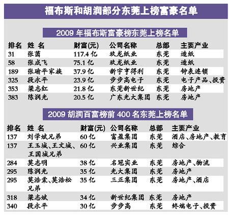 2009福布斯中國(guó)富豪榜昨日(11月5日)發(fā)布。記者從榜單上獲悉,福布斯富豪榜上王傳福以396億元位列第一,其中公司總部在東莞的上榜富豪有6位,張茵以財(cái)富117.4億元排名東莞第一,在整個(gè)2009福布斯中國(guó)富豪榜上排名第31位,其弟弟張成飛則緊追其后排名東莞第2。