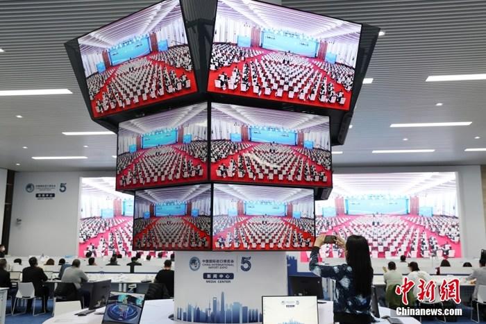 媒體記者在新聞中心觀看第五屆進(jìn)博會開幕式