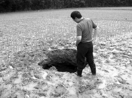 懷遠(yuǎn)鎮(zhèn)政府工作人員尹波也證實說,因為插秧子時向田里灌水,泥土經(jīng)過浸泡后引起了地面的塌陷。