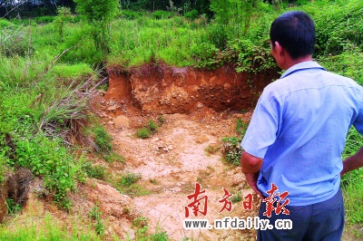 “又地陷了!”今年6月初,龍門縣龍?zhí)舵?zhèn)楊屋村村民再次發(fā)現村周邊的山地發(fā)生地陷時,不安蔓延整個村莊。該村村民稱,從1992年開始,距離村莊約1.5公里外的鉛鋅礦開采后,農田、果場等不斷出現地陷。