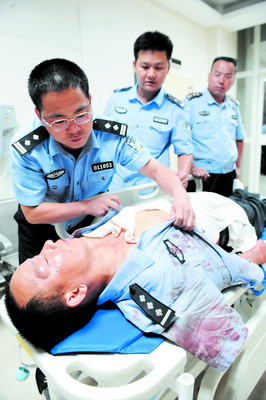 昨晚10時(shí),在湘雅醫(yī)院急診科,這名受傷交警正微閉著眼睛,躺在擔(dān)架上等待放射檢查,蒼白的臉上透露出虛弱。他的警服和警褲上有大面積血漬,白色背心也被撕爛,甚至連襪子和皮鞋都被鮮血浸透。他頭部的右額位置有一個(gè)很大的腫塊,沾滿血跡的右手中指縫合10針后被紗布包著,身上還有多處擦傷。