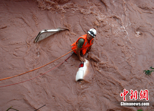 事故現(xiàn)場(chǎng),墜河的汽車是一輛金杯面包車,車體已經(jīng)完全掉入周公河中,由于連日暴雨,周公河河水暴漲,水流湍急,墜河車體只露出車尾的一小部分。汽車在洪水的沖刷下還在不斷晃動(dòng),隨時(shí)有被洪水沖走的可能。