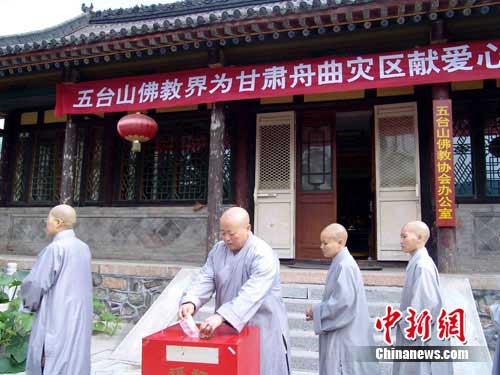 當甘肅舟曲泥石流災害的消息傳到五臺山時,再次揪疼了五臺山僧眾的心。為幫助受災群眾順利重建家園,身在佛門心系天下蒼生的他們,不論是黃廟的,還是青廟的,不論貧富,不分遠近的大大小小的40多處寺廟和近千個四眾弟子,以同樣真切和濟世之情,共同援手,在不到一個小時的時間里,捐款數(shù)達到了53.6380萬元人民幣,其中普壽寺捐款10萬元,萬佛閣6萬元,塔院寺5.5萬元、普化寺5萬元,其它寺院均盡自己的力量出資捐助。目前,善款已轉交有關部門,但捐款活動仍在繼續(xù)進行。