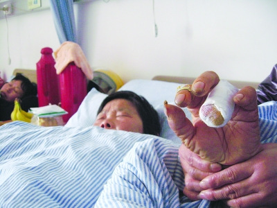 昨天中午,記者在高淳縣人民醫(yī)院見到了邢老太,她此時(shí)躺在病床上,正在掛水,面色異常蒼白,一旁的女兒雙眼通紅,不住地?fù)崦赣H的手臂!罢媸翘^分了,他們能這樣對待一名老人嗎?”女兒哭著告訴記者,那少了的一節(jié)手指就是被城管隊(duì)員硬生生扯斷的。