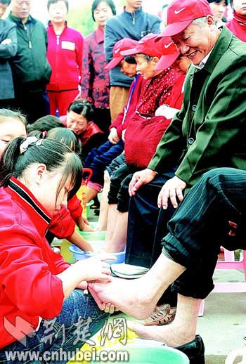 襄樊市委副書記萬桃元得知孫穩(wěn)、李聯(lián)德兩位百歲老人也到了現(xiàn)場,忙迎上前為他們送去祝福。隨后,兩名志愿者來到兩位老人身前為其洗腳。其中一位志愿者名叫汪光房,今年51歲,是襄陽區(qū)文聯(lián)的退休職工。他告訴記者:“敬老愛老是中國的傳統(tǒng)美德,每個人都應該真心行孝,感恩老輩!