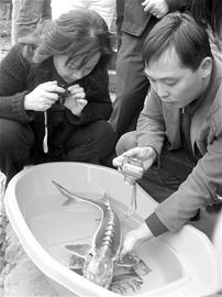 當(dāng)?shù)貪O政管理部門和水產(chǎn)保護(hù)大隊(duì)工作人員迅速趕到,經(jīng)觀察,初步認(rèn)定該魚是和中華鱘一樣珍貴的國家一級保護(hù)野生動物達(dá)氏鱘,遂將該魚送到躉船漁艙喂養(yǎng),請有關(guān)專家作進(jìn)一步鑒定。