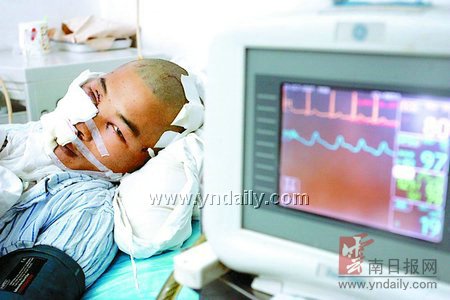 昨日,實施了面部縫合手術后,29歲的陳三拉靜靜地躺在昆醫(yī)附一院口腔頜面外科病床上,他的右臉全部被包了起來,由于傷勢嚴重,已經很難開口說話。