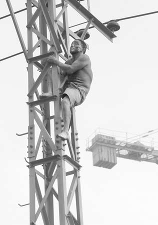 記者立即趕往現(xiàn)場,只見一男子光著上半身,在路邊的高壓電線桿上。此時(shí),110民警、119火警和120救護(hù)車都已到現(xiàn)場,一名中年婦女正拿著擴(kuò)音喇叭操著四川口音大喊:“你先下來,上面有電,小心電到你!”但該男子卻毫不理會(huì),在電線桿上一會(huì)爬上,一會(huì)爬下,還不時(shí)地試圖觸摸頭頂上的高壓電線。圍觀的群眾都大喊他下來,可他就是不聽。記者看到,該男子臉上和胸部流滿了鮮血,血跡已經(jīng)發(fā)黑。