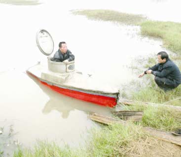 下午4時(shí),試水開始。李玉明鉆進(jìn)潛艇,關(guān)上頂蓋。在卡車的牽引下,整個(gè)潛艇被拖行近10米。在2米多深的水下潛行10秒后,潛艇重新浮出水面。岸上的工作人員擊掌相慶,隨即引燃鞭炮,宣布試航成功。