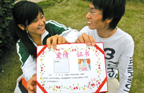 小郭首先在學(xué)校里推出了“愛情證書”,受到同學(xué)們的青睞,然后他又接著在校園網(wǎng)“貼吧”推廣。目前已有不少大學(xué)生情侶訂購。