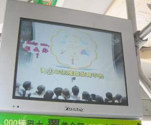 6日上午10時20分,記者在龍昆南路海師大門口處的車站登上了42路公交車。此時,設(shè)在司機后座上方的一個顯示器里,正滾動播出視頻廣告。廣告的內(nèi)容有電影廣告,食品廣告等。