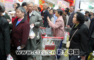 在門口排隊(duì)等待的人越來越多,90%都是老人,東華好又多的員工也開始維持秩序。早上8點(diǎn)30分,超市開門,已經(jīng)等得不耐煩的人們開始往里擠,好又多的員工手拉手形成人墻,一直從入口延伸到擺放著低價(jià)油的商品區(qū)。人群中不時(shí)因?yàn)椴尻?duì)或者被擠而傳出爭(zhēng)吵聲。一位滿頭是汗的大爺對(duì)老伴說,“趕快往前擠,別人都在擠,買不到油可就白來了。”