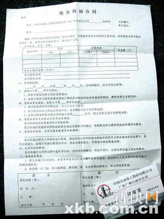 記者又問:“我們能不能簽合同呢?”葉站長說:“當然可以簽!彪S后他當場拿出一份《批次購油合同》,合同上的“供方”就是“中國石油化工股份有限公司廣東廣州石油分公司加油站”。“這些都是正式合同,提貨單位也是我們公司的正式提貨單,發(fā)票也是正式發(fā)票,合作愉快最重要!比~站長說。